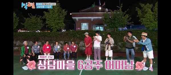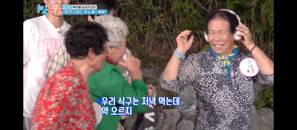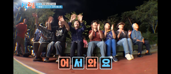 할머니와 짝을 이룬 팀이 제시된 단어 여섯개를 맞출 때마다 할머니들 관광버스 춤시간이 돌아옵니다 ㅋㅋㅋ